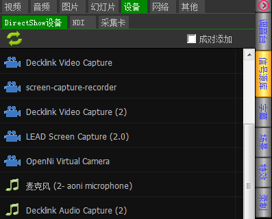 在成对添加允许时,选择一个视频设备或音频设备时,自动添加对应的音频或视频设备到待播区窗口。