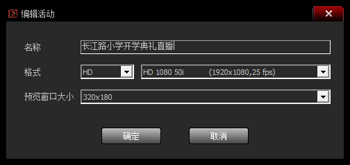 可修改活动名称、信号格式、预览窗口大小等参数。