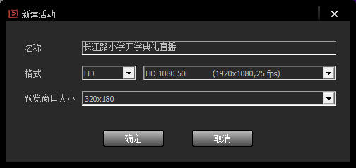 输入活动名称,选择信号格式、预览窗口大小等参数。