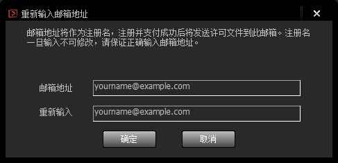 重复输入注册邮箱地址,确保2次输入一致。点击"确定"按钮,将从官方服务器下载试用许可文件,并重新启动软件。