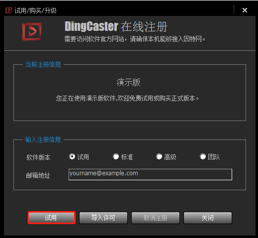 可免费注册为“试用版”,全功能使用30天时间。"演示版"软件开始运行时,会弹出"在线注册"对话框。