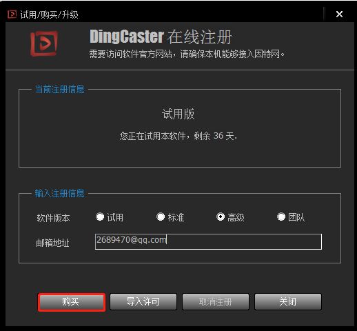 点击"试用/购买/升级",弹出"在线注册"对话框。