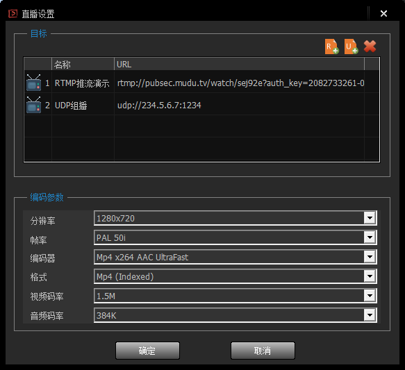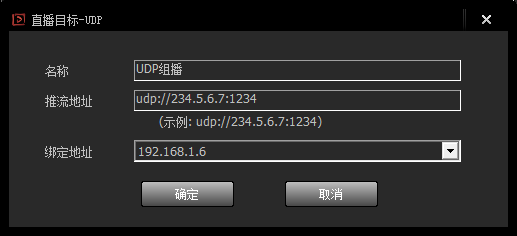 输入直播名称,推流地址和绑定的地址。对于多网卡,需要填写绑定地址。