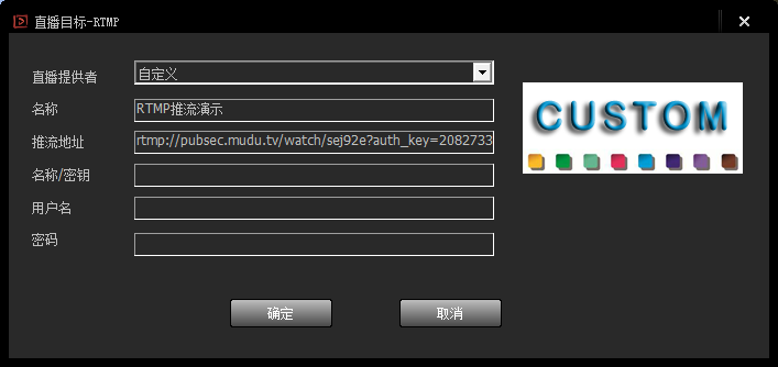 如果选择自定义,可以输入直播名称、推流地址、名称、密钥、用户名和密码等项目,根据实际情况填写,如果没有密钥、用户名或密码,可留空不填。