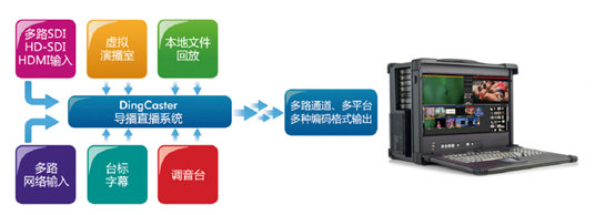 DingCaster为现场制作和流媒体系统,支持有线导播、云导播、混合导播、多平台播出功能;支持多种形式、多路并发的输入输出,包括:SDI/HD-SDI/HDMI、网络、NDI、本地媒体文件、虚拟演播室、多画面等;支持多路抠像、台标字幕、调音台、多路录像、视频实时连线、专业键盘控制等功能。